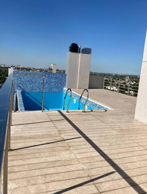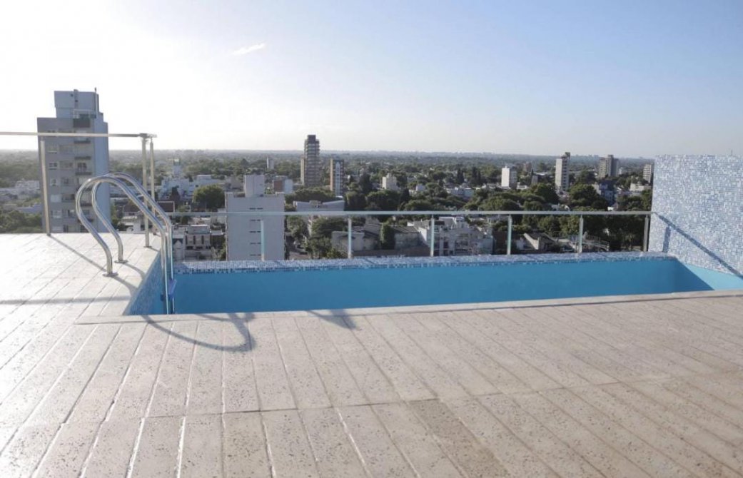 Pileta en la azotea piso 12 con borde infinito y solarium. SUM con parrilla parrilla.